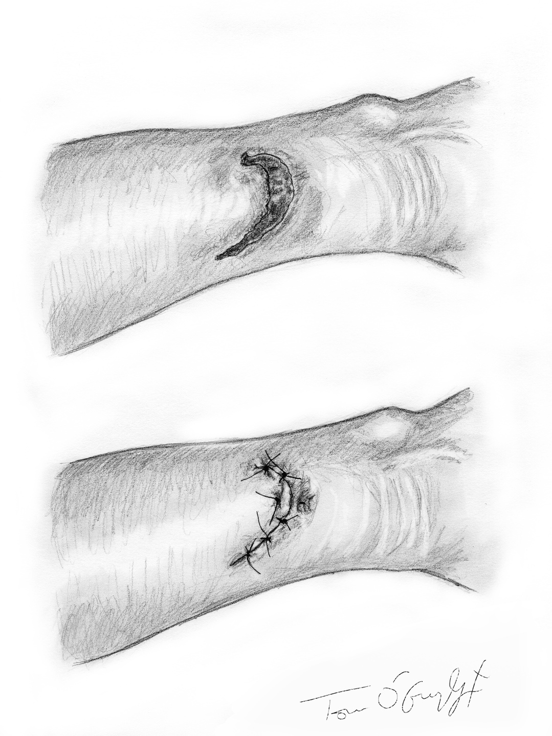 On ne fera pas un exposé de tous les agents vulnérants qui peuvent abîmer la peau, mais le plus souvent pour que la plaie ne soit pas trop profonde il faut que la force portée sur la peau soit faible ou qu’elle ait été déviée au moment de l’impact.