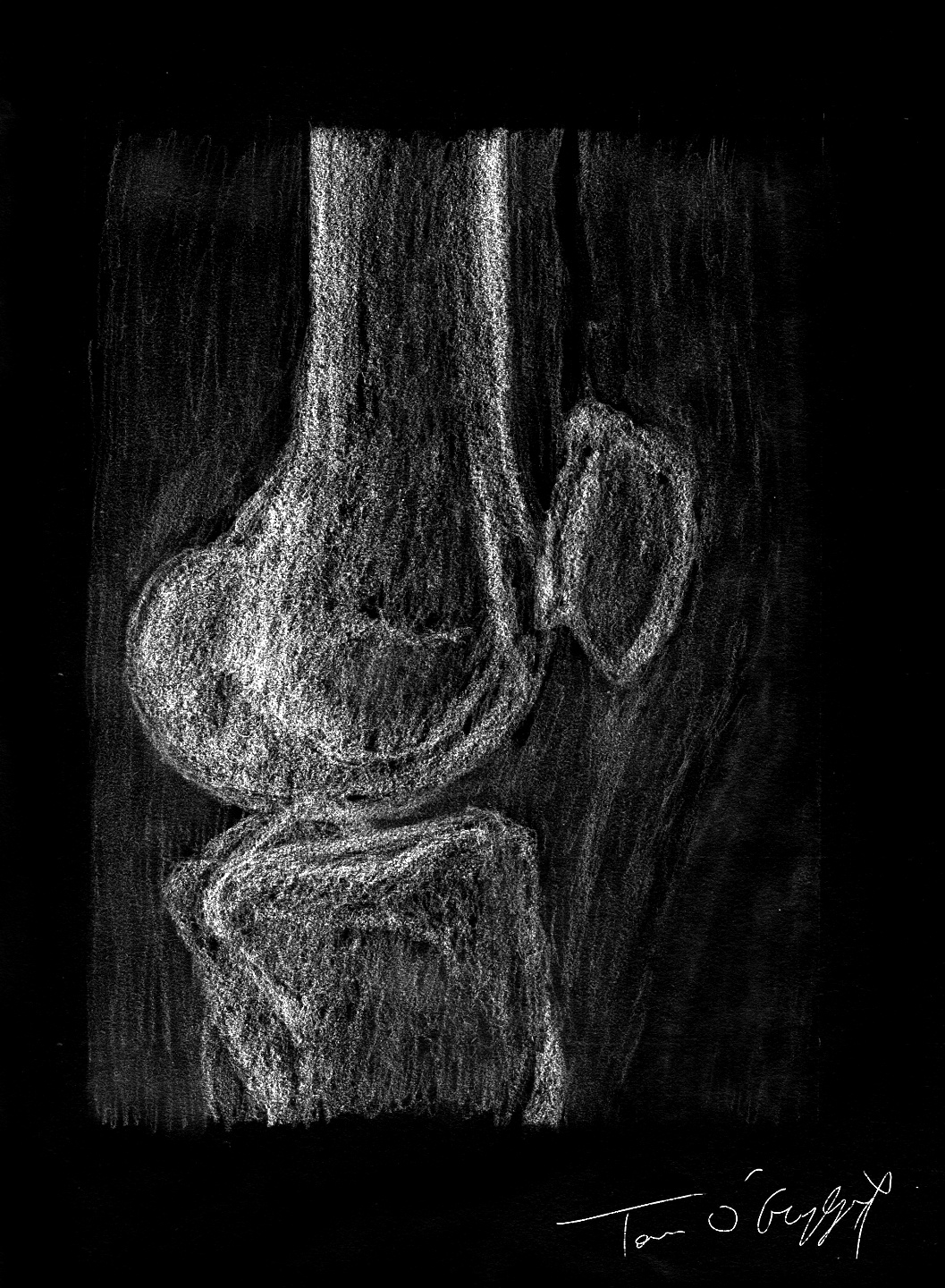 Sur l’illustration, notez le liseré clair au dessus de la rotule, correspondant à une pneumarthrose, présence d’air dans le cul de sac sous quadricipital, témoignant de la brèche de la plaie vers l’articulation.