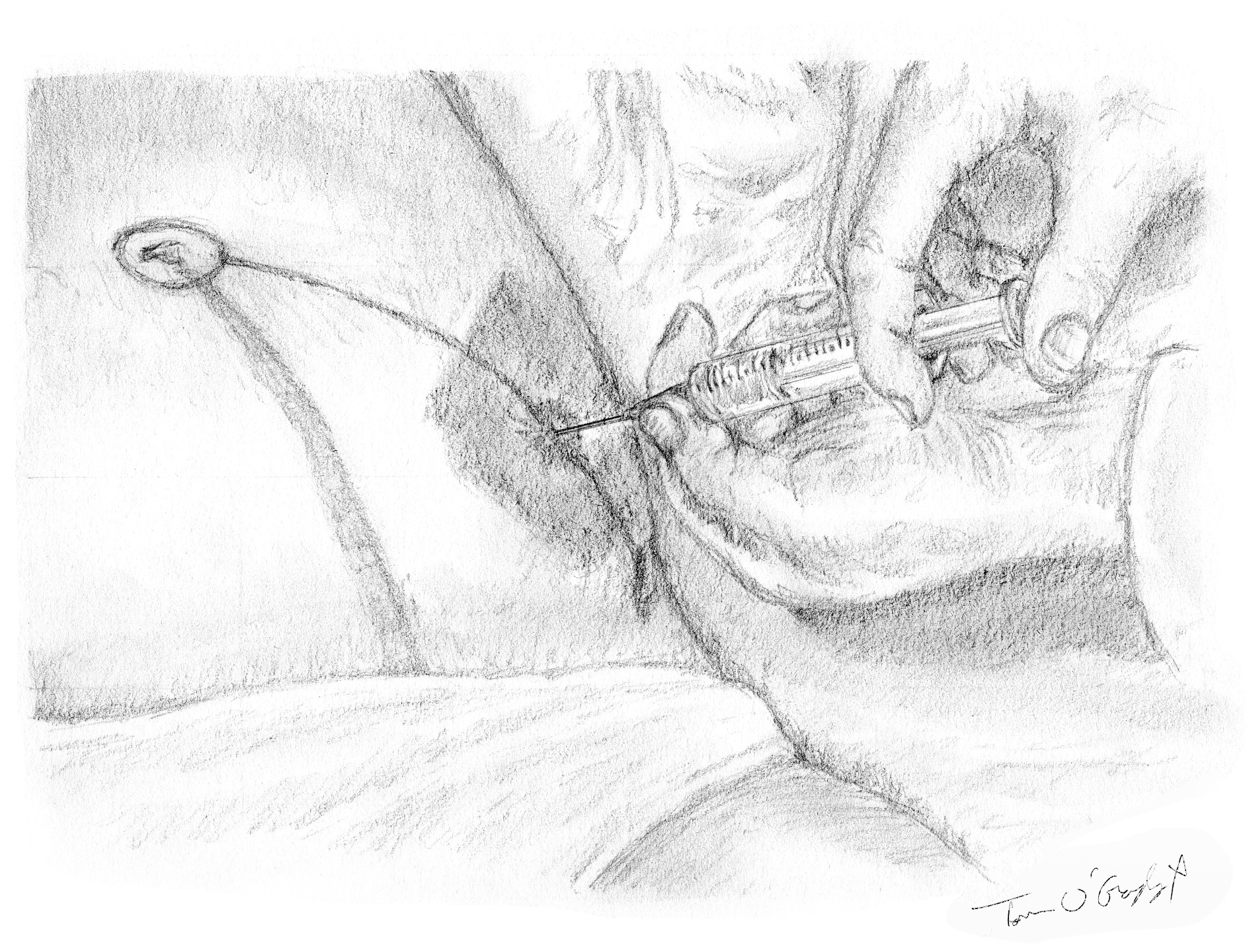 Le retrait du système est très simple, il n’est pas rare qu’il reste un peu de liquide qui fuit par l’orifice de ponction, on laisse donc un pansement légèrement compressif.