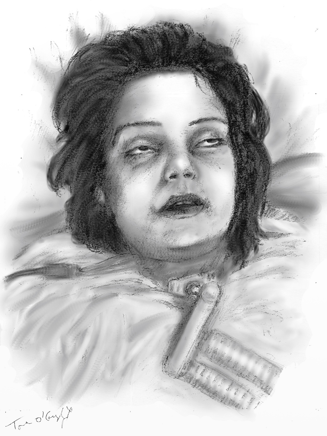 patiente atteinte de botulisme avec ptosis des paupières, sous ventilation assistée par trachéotomie
