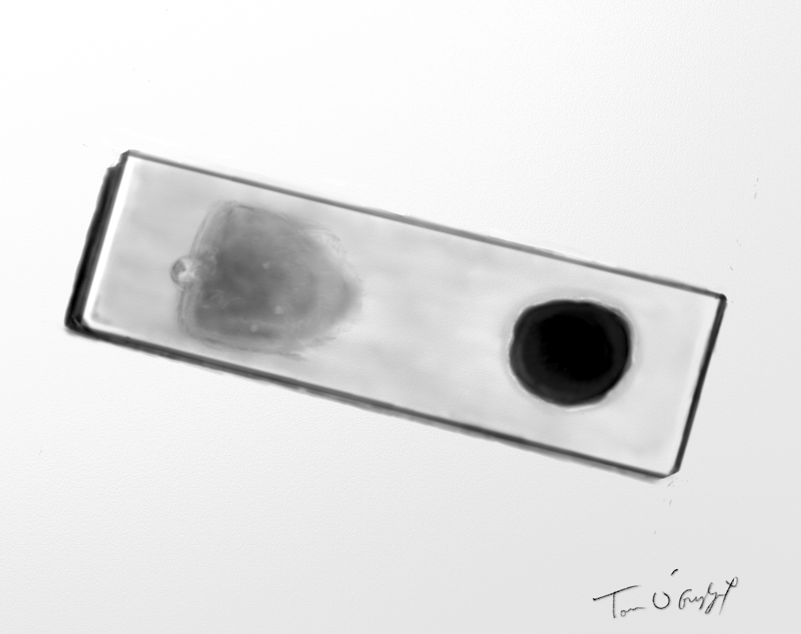 frottis sanguin à gauche et goutte épaisse à droite sur la même lame pour le diagnostic de paludisme au microscope