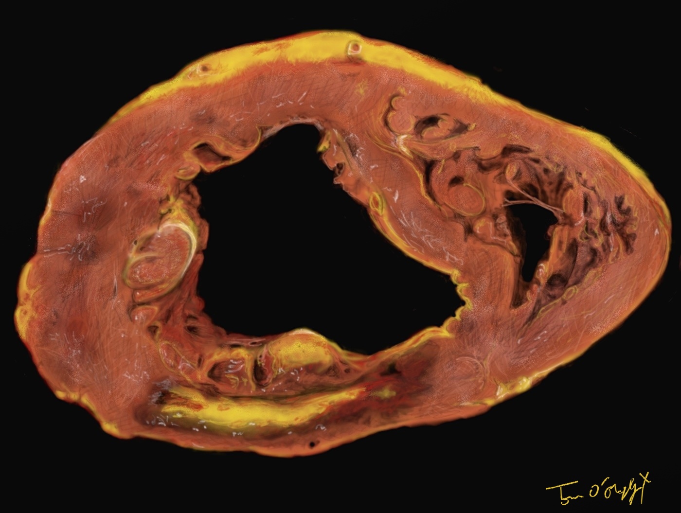 infarctus du myocarde, zone de nécrose en coupe autopsique