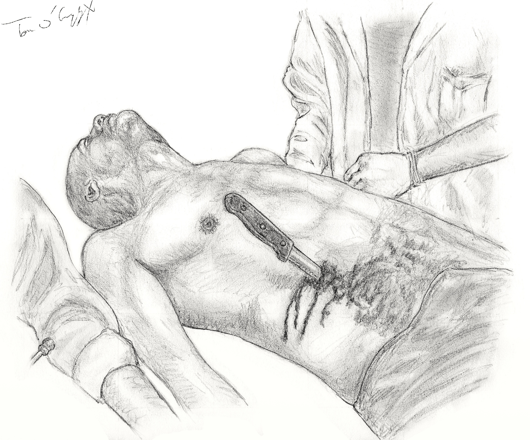 Extraction sur le brancard de 2 stylos ayant pénétré la paroi abdominale antérieure de façon presque parallèle
