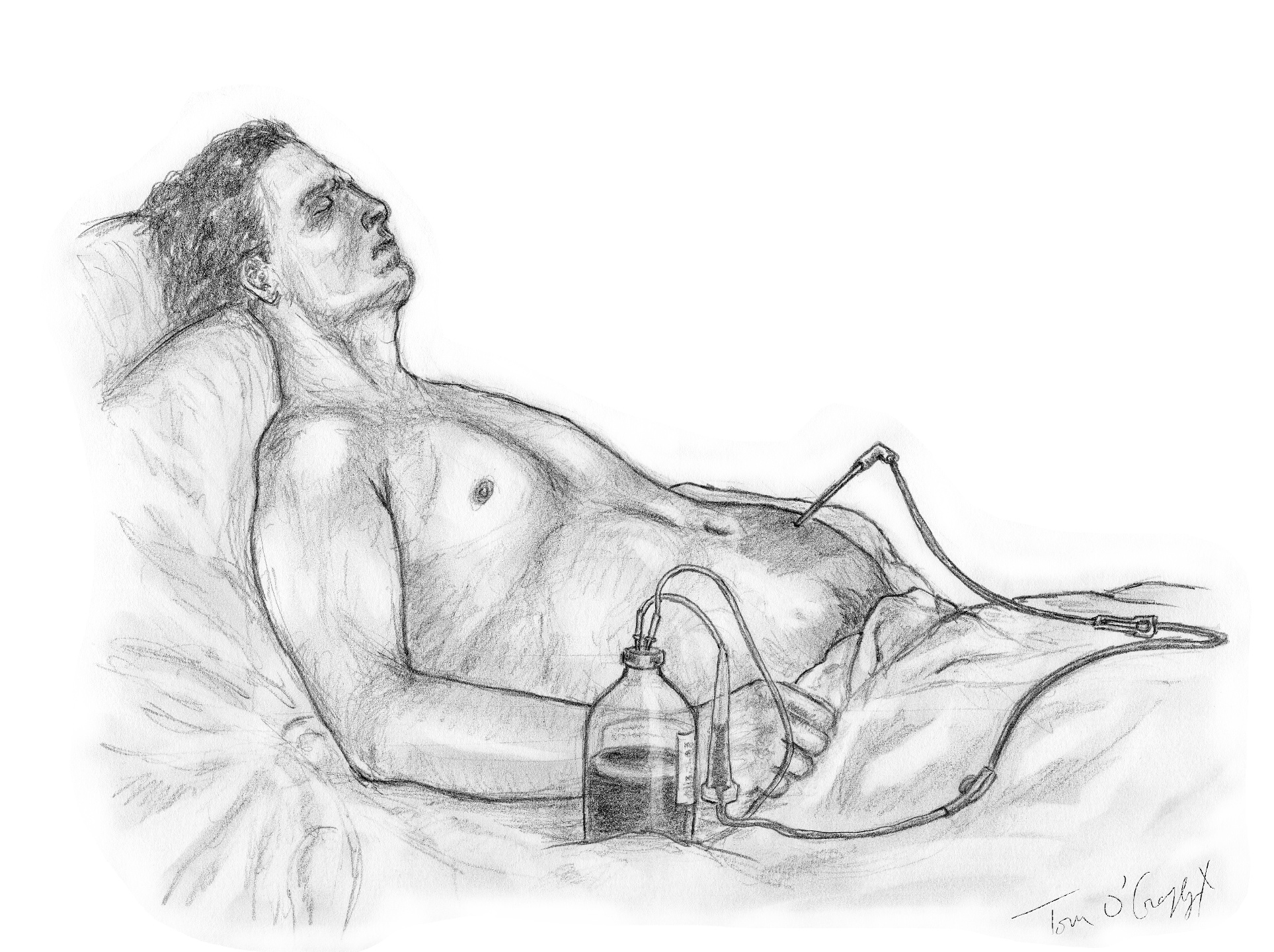 Épanchement assez abondant au bord inférieur du foie lors d’une rupture de kyste du corps jaune ovarien
